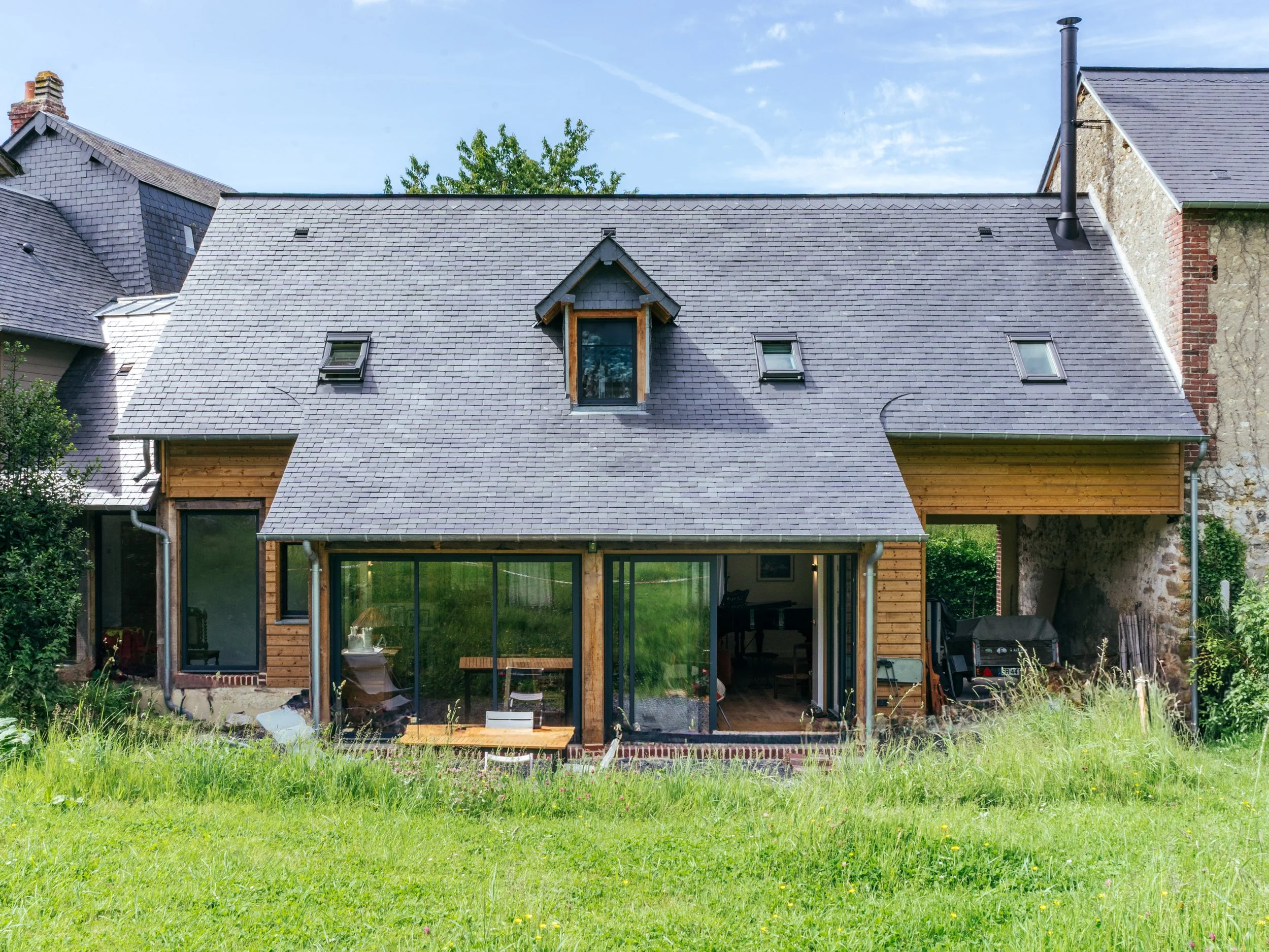 Ce projet réunit rénovation, extension et réfection complète d’une maison. L’ensemble a été repensé pour offrir des espaces de vie lumineux et fonctionnels, tout en valorisant l’architecture existante. Le bardage bois vient habiller les façades et donner une nouvelle identité à la maison, dans une approche à la fois contemporaine et respectueuse de son environnement.